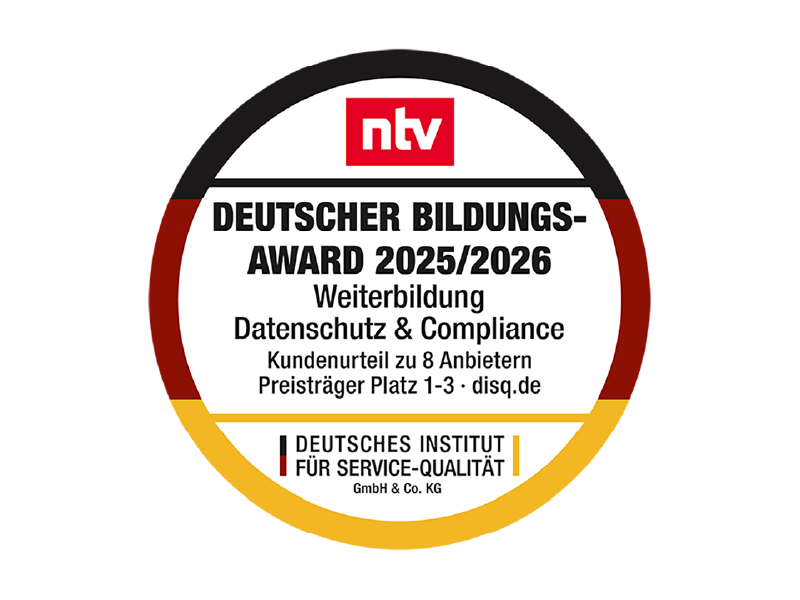 Unser eLearning-Angebot DSN train gewann in der Kategorie Berufliche Aus- und Weiterbildung im Themenfeld Datenschutz und Compliance. Der Deutsche Bildungs-Award wird jährlich von ntv und dem DISQ – Deutsches Institut für Service-Qualität GmbH & Co. KG verliehen.