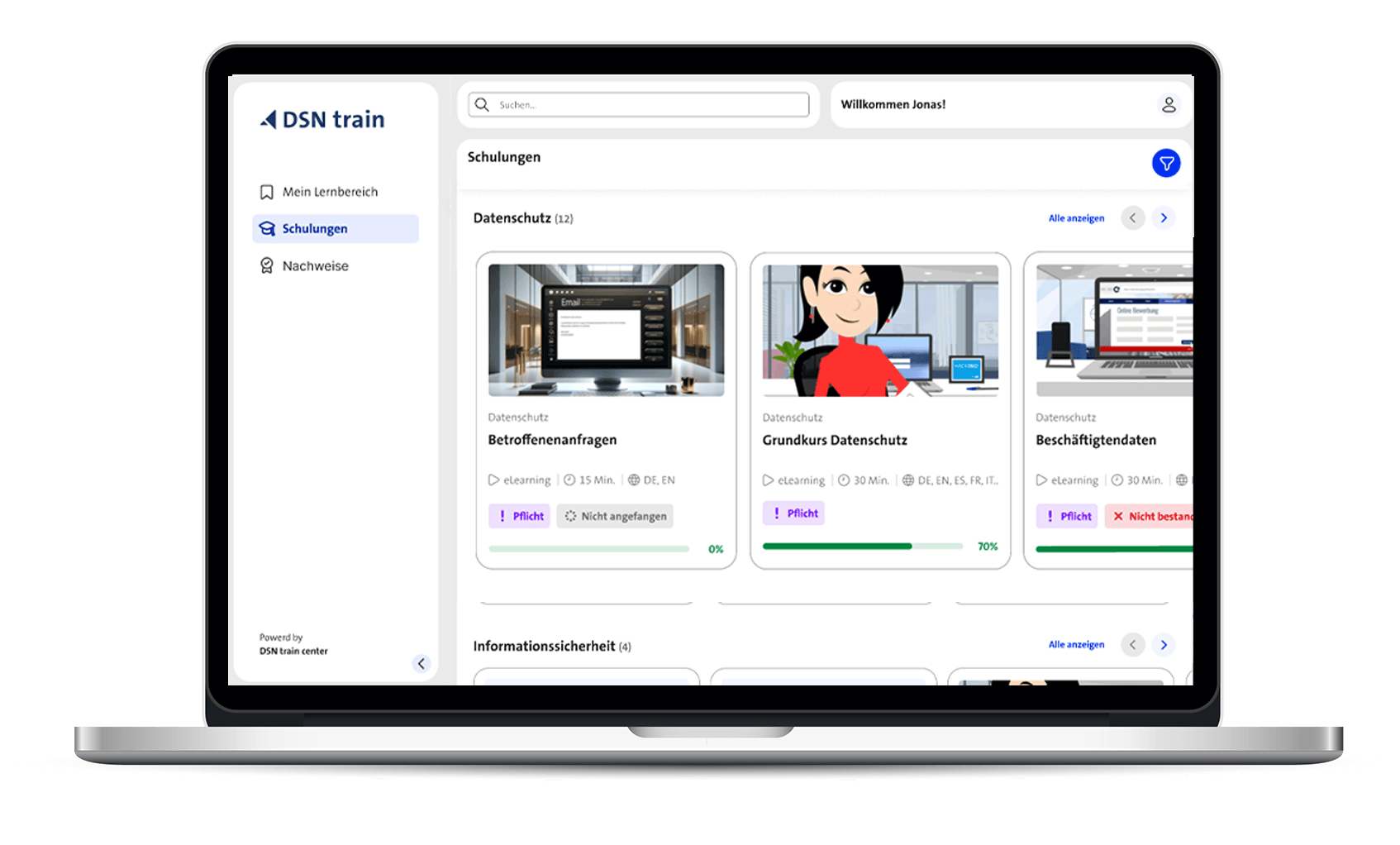 DSN traincenter bietet Ihnen alle Funktionen, die Sie von einer modernen Lernplattform erwarten dürfen. Unser LMS ist als „Software as a Service“ (SaaS) konzipiert, Sie haben also keinen Installationsaufwand. Bei der Sicherheit machen Sie ebenfalls keinerlei Abstriche – ganz im Gegenteil! Nutzende mit Zugang zu den Verwaltungsfunktionen der Plattform erhalten eine sichere Zwei-Faktor-Authentisierung. Zudem wird die Software von einem erfahrenen Entwicklerteam am Standort Bremen betreut und in deutschen Rechenzentren gehostet, die nach ISO/IEC 27001 zertifiziert sind. Ein Pentest-Team unterzieht die Lernplattform zudem regelmäßigen Penetrationstests, damit die personenbezogenen Daten Ihrer Organisation sicher sind.